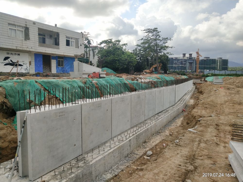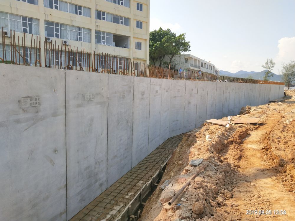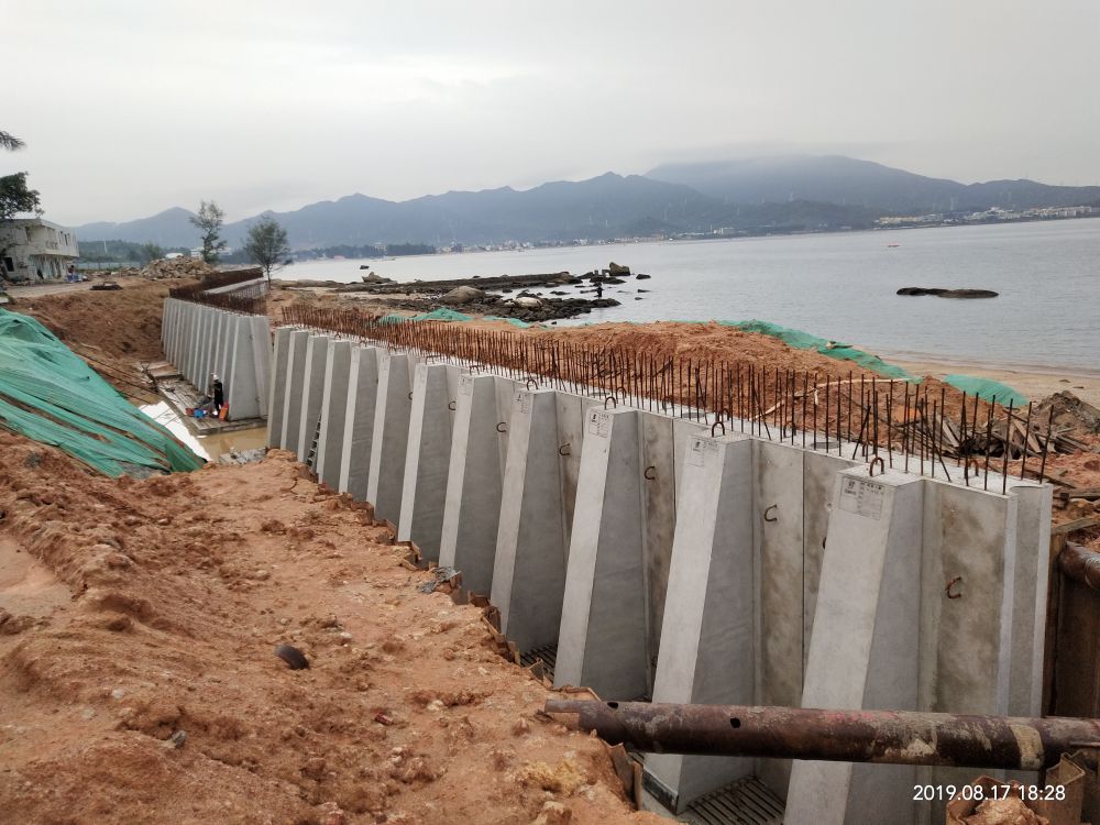 本項目為共青團深圳市委教育基地海堤災后修復工程項目,采用4種不同高度的預制擋土墻,預制構件應用于搶險救急項目,大大降低了施工作業難度,減少工期,加速防汛海堤的建設。